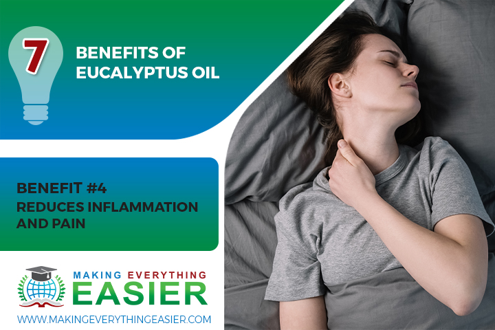 There are a few different ways that you can use eucalyptus oil to reduce inflammation and pain in your body. One of the simplest methods is to add a few drops of the oil to a warm bath and soak in it for 20 minutes. You can also create a compress by soaking a cloth in a mixture of eucalyptus oil and water, then applying it to the affected area for ten to fifteen minutes. If you're dealing with a headache or migraine, you can put a few drops of eucalyptus oil on a cotton ball and inhale the fumes.