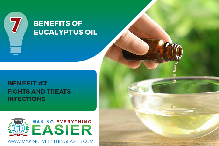 Additionally, eucalyptol has been shown to boost the immune system. This makes it more effective at fighting infections. For these reasons, eucalyptus oil is an excellent natural remedy for treating infections, like bronchitis, sinusitis, and ear infections.