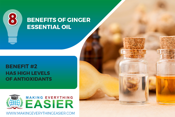 Ginger oil is a type of essential oil that is extracted from the roots of the plant Zingiber officinale. Ginger oil has many benefits, including being an antioxidant; antioxidants are substances that can prevent or delay cell damage by oxidative stress. Oxidative stress is a process that occurs when there is an imbalance between the production of free radicals and the body's ability to detoxify them; free radicals are unstable molecules that can damage the cells, leading to inflammation and disease. Ginger oil is a powerful antioxidant because it contains the compounds gingerol and zingerone; these compounds scavenge free radicals and help neutralize them. Additionally, ginger oil stimulates the production of enzymes that detoxify free radicals.