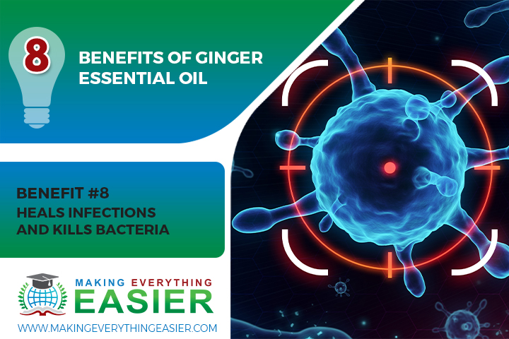 Ginger oil is a natural remedy for infections. The compound gingerol in ginger oil has been shown to kill bacteria and viruses. One study found that topical application of two percent of ginger oil can greatly reduce the number of bacteria on the skin. Essential oils are a powerful tool in the fight against infection. Ginger oil, in particular, has antimicrobial properties that can help kill bacteria and fungi; it also has anti-inflammatory properties that can speed up healing and reduce swelling.