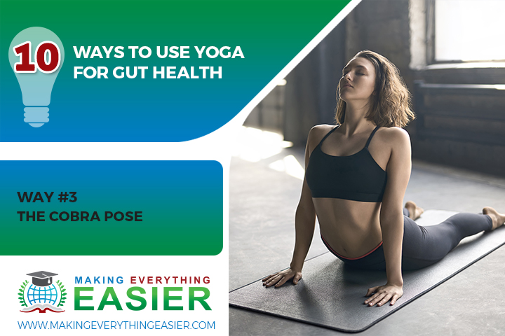 The cobra pose is a restorative yoga pose that helps improve digestion. It can alleviate stress and anxiety. It can also help reduce the risk of constipation by toning the muscles of the digestive tract.