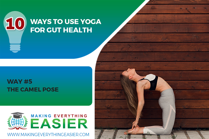 The camel pose is a restorative yoga pose that helps improve digestion. It can alleviate stress and anxiety. It can also help reduce the risk of constipation by toning the muscles of the digestive tract.