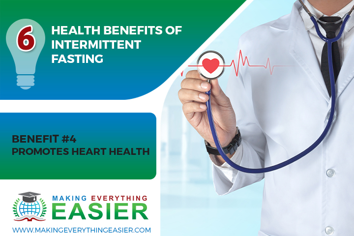 Intermittent fasting has been shown to promote heart health by reducing the levels of LDL cholesterol and triglycerides in the blood. LDL cholesterol is the "bad" type of cholesterol that can build up on the walls of arteries and cause blockages. Triglycerides are a type of fat that can also contribute to heart disease. By reducing the levels of these substances in the blood, intermittent fasting can help reduce your risk of developing heart disease.